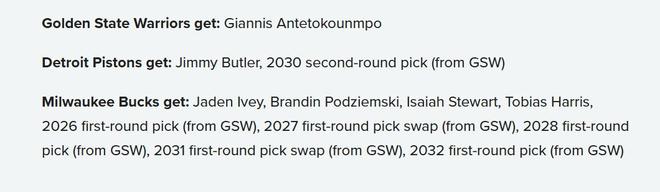 雄鹿得到:艾维+波杰+斯图尔特+哈里斯+26年首轮(勇士)+27年首轮互换(勇士)+28年首轮(勇士)+31年首轮互换(勇士)+32年首轮(勇士)。